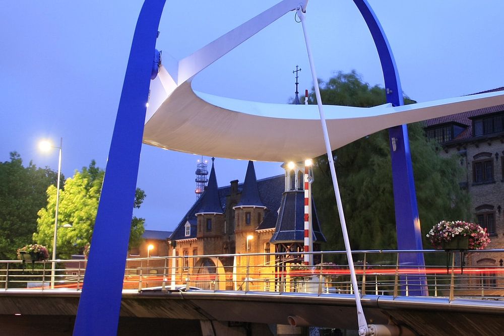 'De brug naar een vrije toekomst'. Moderne brug bij cultureel centrum en voormalig gevangenis 'de Blokhuispoort'.