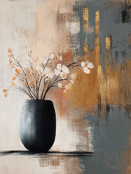 Bloom Echo - Dieses florale Gemälde zeigt eine dunkle Vase auf einer verspiegelten Oberfläche mit mehreren Zweigen, die mit zarten weißen und orangefarbenen Blüten vor einem abstrakten Hintergrund aus grauen, weißen und goldenen strukturierten Flächen verziert sind.