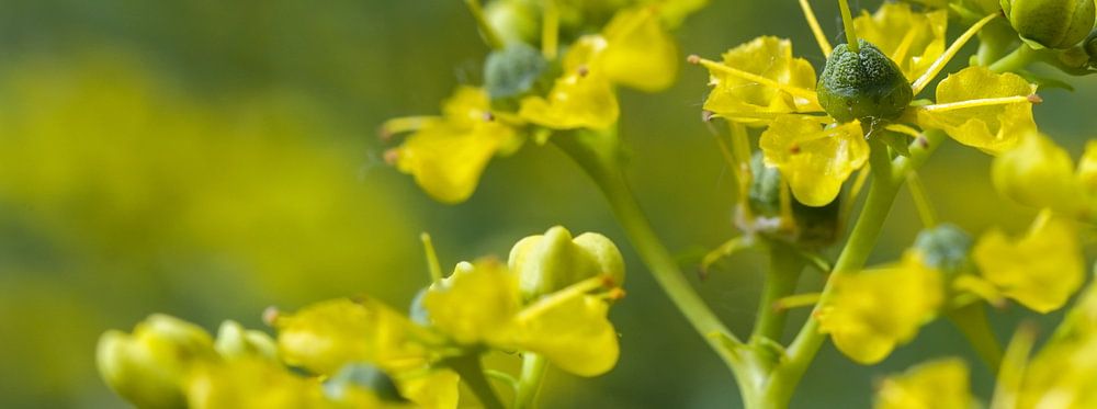 Gelbe Blüten der Weinraute (Ruta graveolens) Makroaufname vor grünem Hintergrund