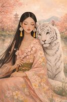 Eine bezaubernde und ruhige Illustration, in der Mensch und Natur harmonisch miteinander verschmelzen. Die zarten Blütentöne, der elegante Kimono und der majestätische weiße Tiger schaffen eine verträumte, fast märchenhafte Atmosphäre. Dieses Kunstwerk strahlt Ruhe, Kraft und Raffinesse aus – ein perfekter Blickfang für ein stilvolles…