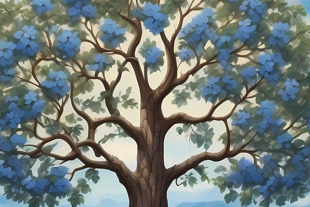 Dieses Bild zeigt eine ruhige und idyllische Landschaft mit einem majestätischen Baum als zentralem Blickpunkt. Der Baum zeichnet sich durch einen dicken, knorrigen Stamm und eine volle, runde Baumkrone aus, die mit leuchtend blauen Blüten geschmückt ist und einen auffälligen Kontrast zur Umgebung bildet. Der Hintergrund zeigt ein malerisches Tal mit sanften Hügeln, üppigem Grün und entfernten Gebirgszügen, die alle von einem sanften, bewölkten Himmel umhüllt sind. Die gesamte Farbpalette ist beruhigend und wird von Blau- und Grüntönen sowie sanften Pastellfarben dominiert, die ein Gefühl von Ruhe und Harmonie hervorrufen. Die Komposition ist ausgewogen und lenkt den Blick des Betrachters auf den zentralen Baum, während die umgebende Landschaft zu der friedlichen Atmosphäre beiträgt. Der Stil ähnelt digitaler Malerei mit einem Hauch von impressionistischem Flair, wobei weiche Kanten und eine traumhafte Qualität betont werden.