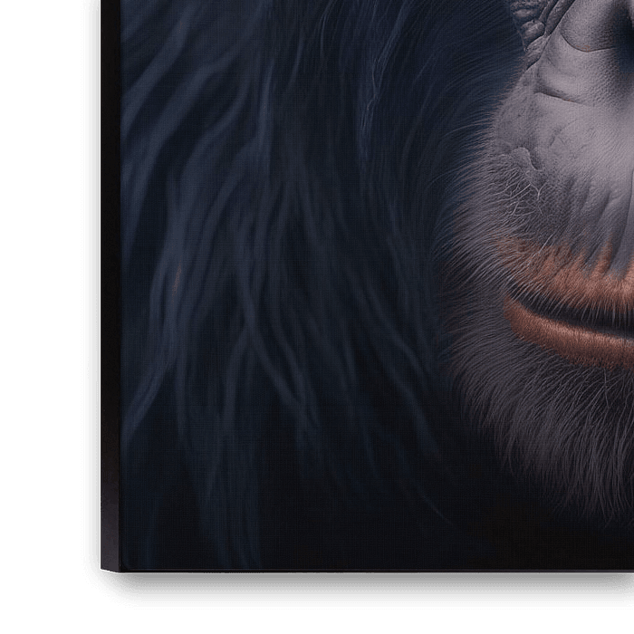 Das Bild zeigt einen ausdrucksstarken Schimpansen mit einem dunklen, bläulichen Fell in einem großen Portrait. Der Schimpanse schaut mit einem klaren Blick direkt in die Kamera, was seinen Charakter noch intensiver zum Ausdruck bringt. Der Hintergrund ist dunkel, was den Fokus des Betrachters auf den schimmernden Pelz und das eindringliche Gesicht des Schimpansen lenkt. Ein solch faszinierendes Portrait eines Tiers fängt die Schönheit und das Wesen des Tieres perfekt ein.