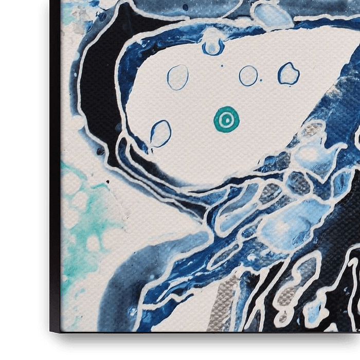 Abstraktes Gemälde mit einem Wirbel aus Blau, Weiß und Schwarz, die zusammen ein energiegeladenes und dynamisches Bild ergeben.