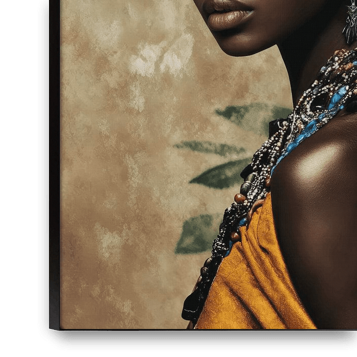 Dieses Bild strahlt Stärke und Eleganz aus. Die Frau trägt ein wunderschön gewickeltes Kopftuch, das mit gelben Blumen verziert ist, die ihren tiefen, warmen Hautton betonen. Die Details des Schmucks und ihr selbstbewusster Blick verleihen ihr ein zeitloses, fast königliches Aussehen.