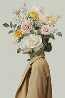 Ein surreales Porträt, in dem eine Figur in einem stilvollen kamelfarbenen Mantel mit einem üppigen Blumenstrauß verschmilzt. Die Komposition zeigt ein harmonisches Zusammenspiel aus cremeweißen, zartrosa und gelben Rosen, begleitet von anmutigen grünen Blättern vor einem beruhigenden hellgrauen Hintergrund. Das Bild vereint Mode, Natur…