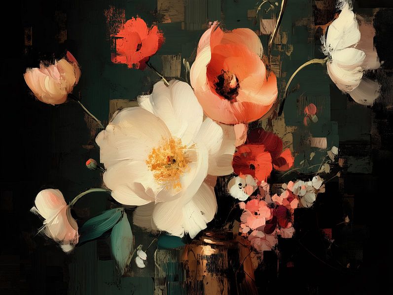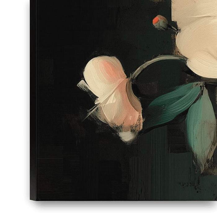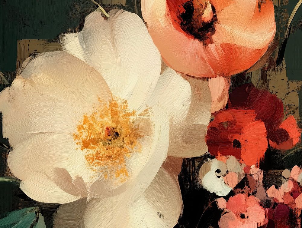 Ein ausdrucksstarkes Blumenstillleben mit zarten Elfenbein- und Korallenblüten, die sich von einem dunklen, strukturierten Hintergrund abheben, gemalt mit kräftigen, impressionistischen Pinselstrichen, die Wärme, Tiefe und ruhige Eleganz ausstrahlen.