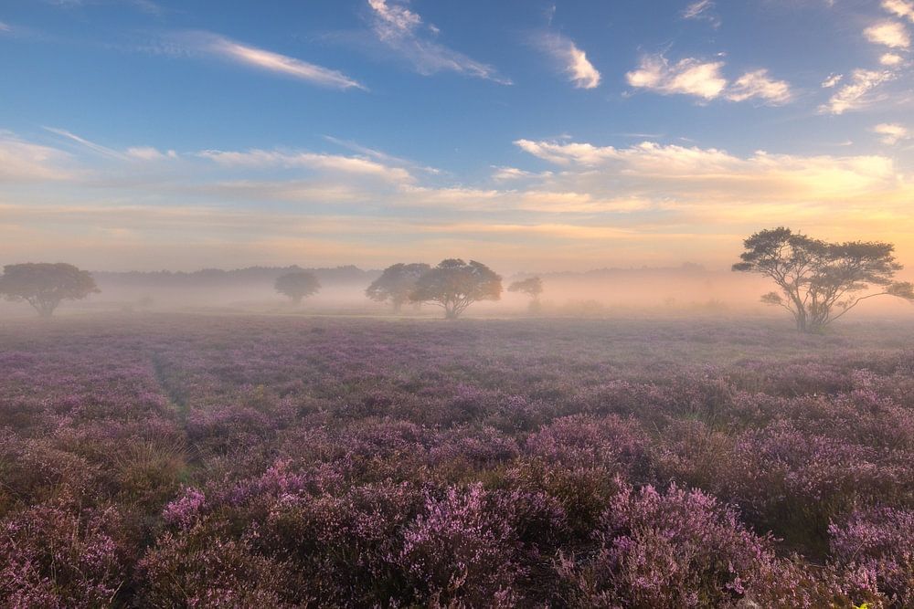 Frühes Aufstehen zahlt sich aus, um die richtigen Stimmungen einzufangen. In den Sommermonaten ist die Chance groß, dass das Heidekraut blüht und sich dann in schöne arktische Farben verwandelt. Ende August oder Anfang September besteht auch die Chance auf ein wenig Nebel. Wenn man dann einen schönen Sonnenaufgang hat, kann man solche Momente einfangen. Eine farbenfrohe Szene zum Genießen. Im Gooi gibt es die Westerheide und die Zuiderheide, wo man solche Momente im Sommer fotografieren kann.