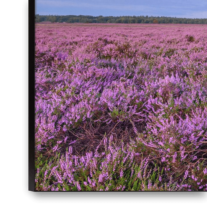 Bestelle dieses Blumen-Wandbild Blühende Heidepflanzen in Heidelandschaft während des Sonnenaufgangs im Sommer von Sjoerd van der Wal Fotografie als Reproduktion auf Leinwand, Alu-Dibond, als Poster, Fototapete oder Acrylglasbild.