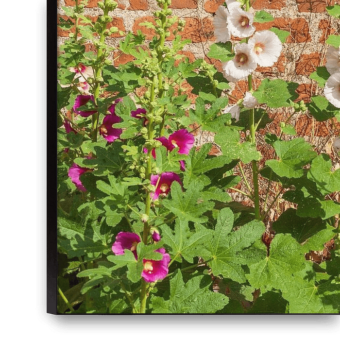 Bestelle dieses Blumen-Wandbild Blühende Stockmalven vor einem Tor von Torsten Krüger als Reproduktion auf Leinwand, Alu-Dibond, als Poster, Fototapete oder Acrylglasbild.