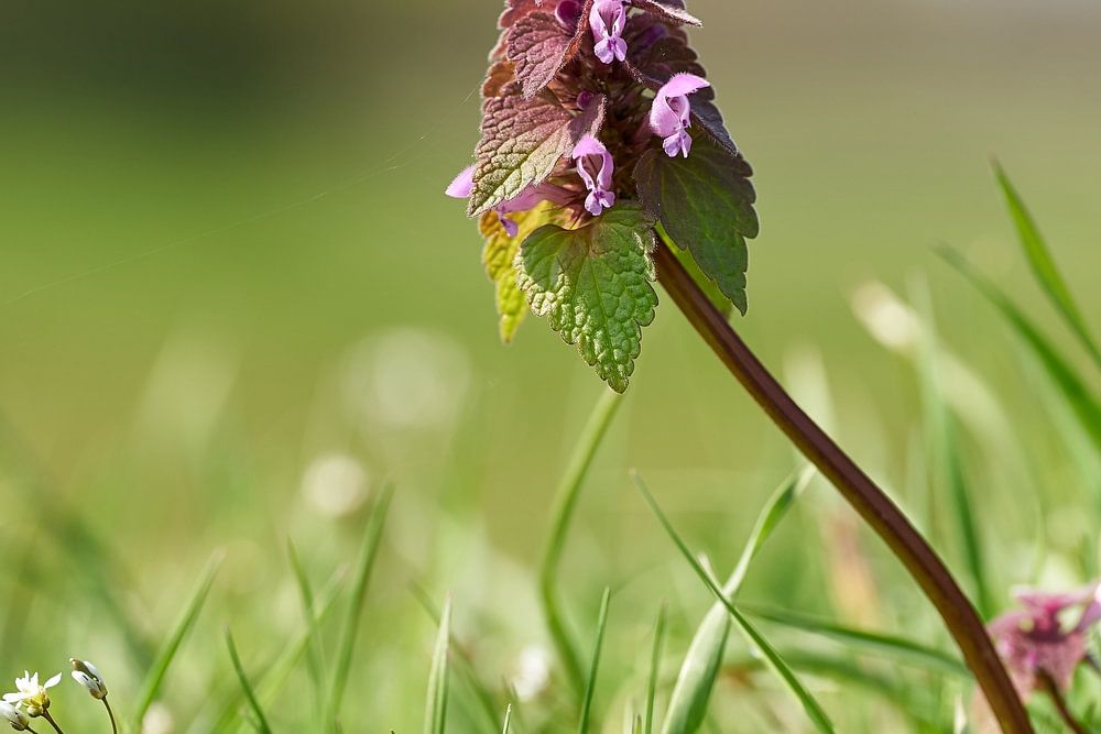 Blühende Taubnessel, Lamium purpureum, auf einer grünen Wiese in einem Naturschutzgebiet im Herrenkrug Park bei Magdeburg in Deutschland im Frühjahr