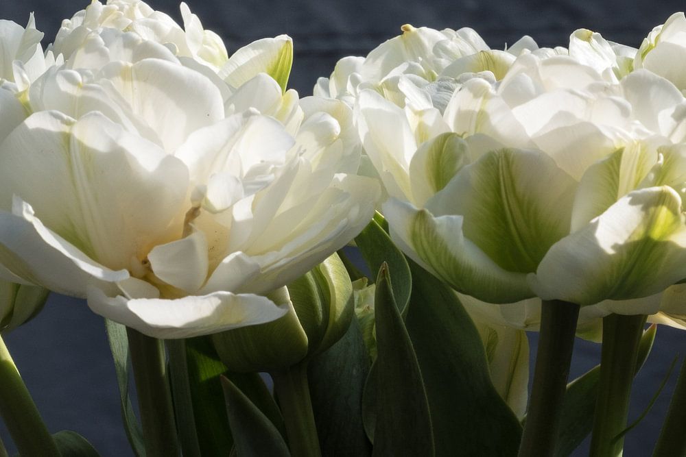 Weiße Tulpen blühen in der Vase vor einem dunklen Hintergrund. Die Sonne scheint durch die Blumen, es ist Frühling.