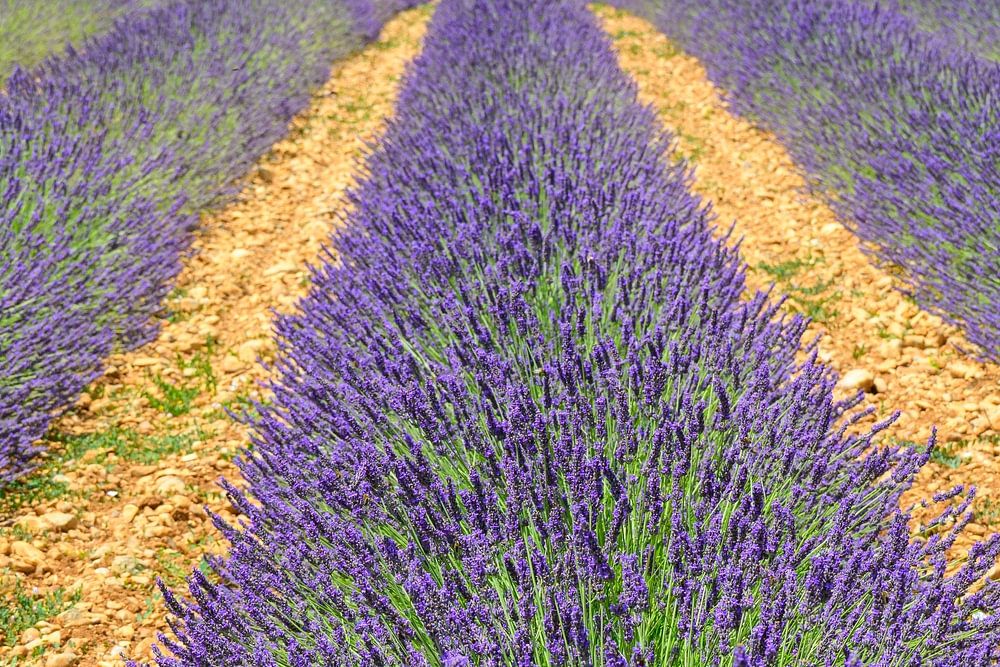 Lavendelblüten auf der Hochebene von Valensole in der Provence an einem Sommertag. Die Blütezeit ist je nach Wetterlage und Höhenlage zwischen Ende Juni und Mitte Juli. Die Luft ist erfüllt vom Summen der Bienen, und der Duft von Lavendel durchdringt die Luft. In der Nähe wachsen goldene Weizenfelder, die einen farbenfrohen Kontrast bilden. Zu den lokalen Produkten gehören Lavendelöl, Seifen, Liköre und Honig.