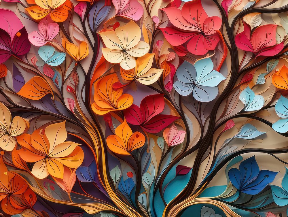 Dieses atemberaubende Bild mit dem Titel "Tree of Life in Bloom" (Lebensbaum in Blüte) zeigt einen wunderschönen Baum, der reich mit einer Vielzahl von Blumen und Farben gefüllt ist, die zusammen ein lebendiges Mosaik natürlicher Pracht bilden. Dieses Kunstwerk wäre ein bezaubernder Mittelpunkt in einem Interieur, das eine Verbindung mit der Natur anstrebt, wie z. B. ein botanisches Gewächshaus, ein beruhigendes Spa oder als atmosphärisches Element in einem hellen und luftigen Wohnzimmer.