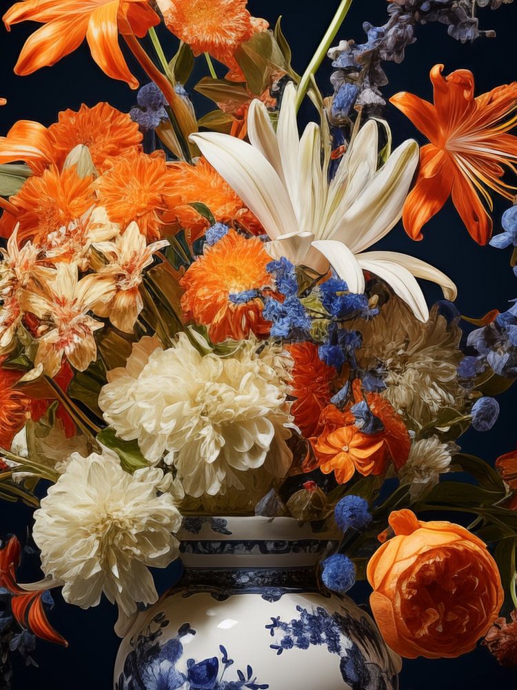 Üppiges Blumenarrangement in einer klassischen, blau-weißen Vase mit einem an Delfter Keramik erinnernden Design. Die Komposition der Blumen ist sorgfältig ausgewählt, mit einer reichen Farbpalette, die von leuchtenden Orangen und tiefen Blautönen bis hin zu zarten Weiß- und Cremetönen reicht. Die orangefarbenen Lilien und Ranunkeln heben sich leuchtend von dem dunklen Hintergrund ab, während die blauen Blumen für Tiefe und Kontrast sorgen.