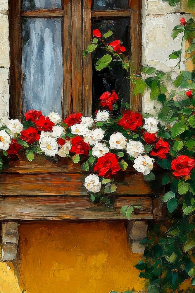 Ein warmes Gelb umhüllt ein charmantes Fenster, dessen Holzrahmen Geschichten aus vergangenen Tagen flüstert. Üppige Blumen in prächtigen Rot- und Weißtönen sprengen den Alltag und fügen einen Hauch von Lebendigkeit hinzu. Das sanfte Spiel von Licht und Schatten in der Mauer erzählt von der Zeit, während die Pflanzen voller Leben das Bild erblühen lassen.