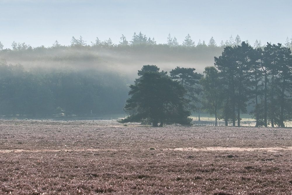 Blühende Moorlandschaft mit einigen Bäumen im Hintergrund und aufsteigendem Nebel. Das Foto wurde an einem Morgen im August aufgenommen.