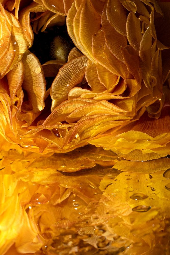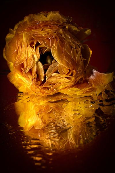 Eine zarte Ranunkel, eingefangen in einem Moment intensiver Schönheit. Die warmen Orange- und Goldtöne spiegeln sich im stillen Wasser wider, wo Realität und Spiegelung miteinander verschmelzen. Eine Hommage an vergängliche Schönheit und das Licht, das Blumen trägt.