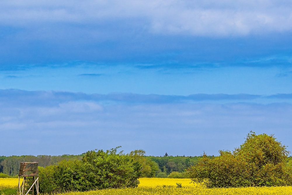 Blühendes Rapsfeld und Bäume bei Purkshof im Frühling.