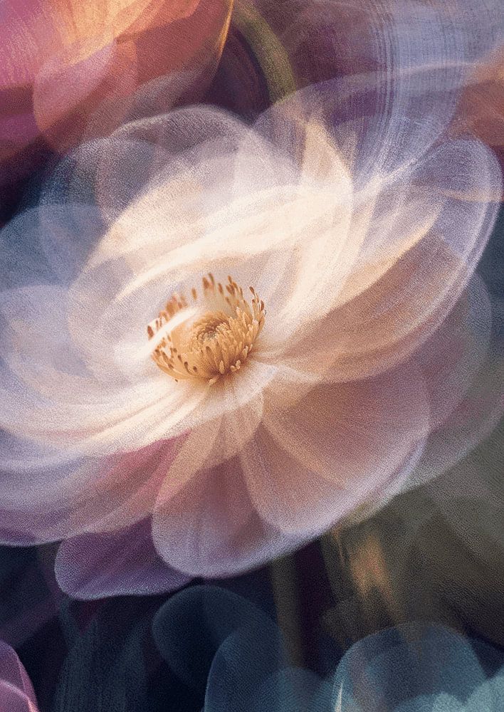 Ein verträumtes, lang belichtetes Fine-Art-Stillleben eines wunderschön gefärbten Blumenstraußes in Bewegung. Die Blumen scheinen in einem Traum miteinander zu interagieren.