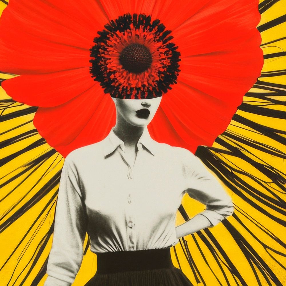 Ein faszinierendes Spiel aus Farbe und Form entfaltet sich: Eine elegante Figur, gekleidet in zeitloser Schönheit, wird von einem explodierenden roten Mohnblumen-Kopfschmuck umrahmt. Schwarzschimmernde Linien ziehen sich wie feine Äste um sie herum, während der strahlend gelbe Hintergrund lebhaft mit der Komposition kontrastiert. Ein Meisterwerk, das die Grenzen zwischen Mensch und Natur verschwimmen lässt.