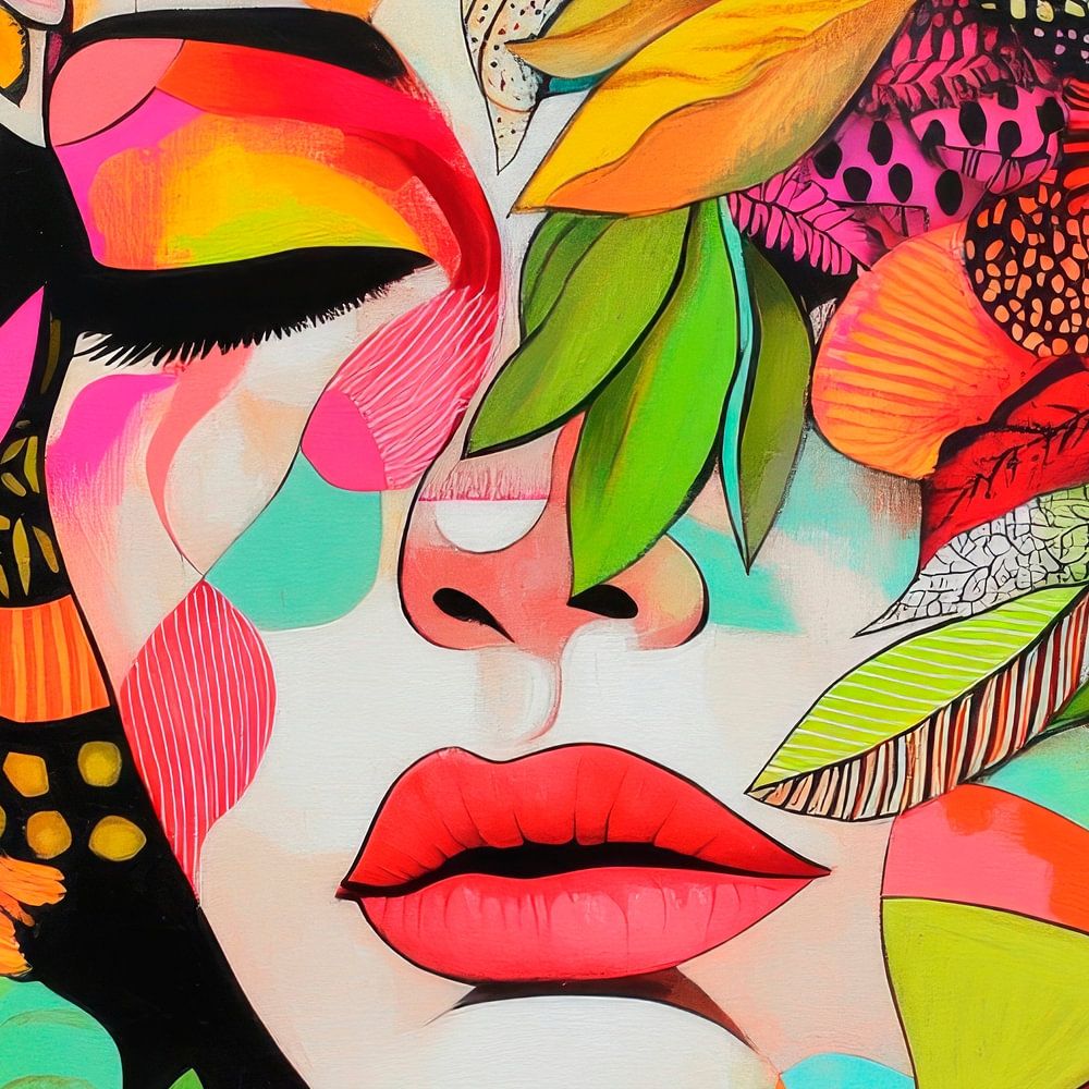 Das Bild zeigt ein faszinierendes Portrait einer Frau, deren Gesicht von leuchtenden Blumen und Blättern umrahmt wird. Die kontrastreichen Farben und der expressive Stil verleihen der Komposition Lebendigkeit. Besonders auffällig sind die intensiven Lippenfarben und die Vielfalt der floralen Motive, die eine harmonische Verbindung zwischen Mensch und Natur schaffen.