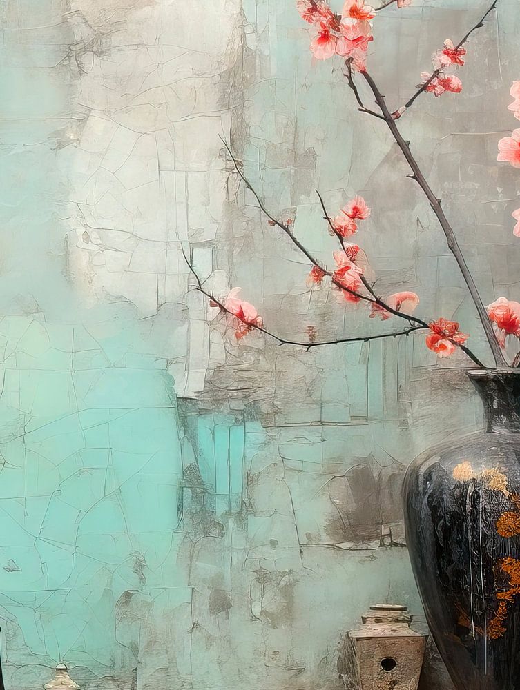 Schlüsselwörter: Blumenstillleben, Wabi-Sabi-Kunst, Japandi-Innenraummalerei, zeitlose Wanddekoration, zeitlos, poetisches Stillleben, Blütenzweigmalerei, atmosphärische Kunst, Vergänglichkeit in der Kunst, mystische Stilllebenmalerei, Jorali Fotografie und Malerei