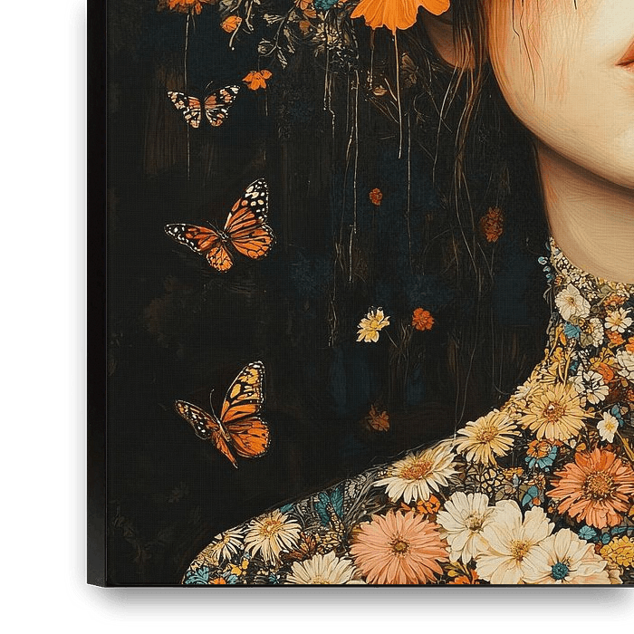Bestelle dieses Blumen-Wandbild Blumen | Blumen Schmetterlinge Frau von Blickfänger Gemälde als Reproduktion auf Leinwand, Alu-Dibond, als Poster, Fototapete oder Acrylglasbild.