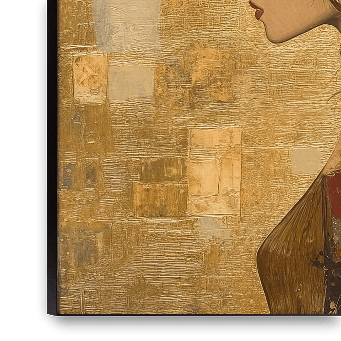 Details: Blumenbild, abstraktes Gemälde, Frauenbild, goldene Farben, moderne Kunst, Blumenfrisur, Frau mit Blumen, anmutige Frau,…