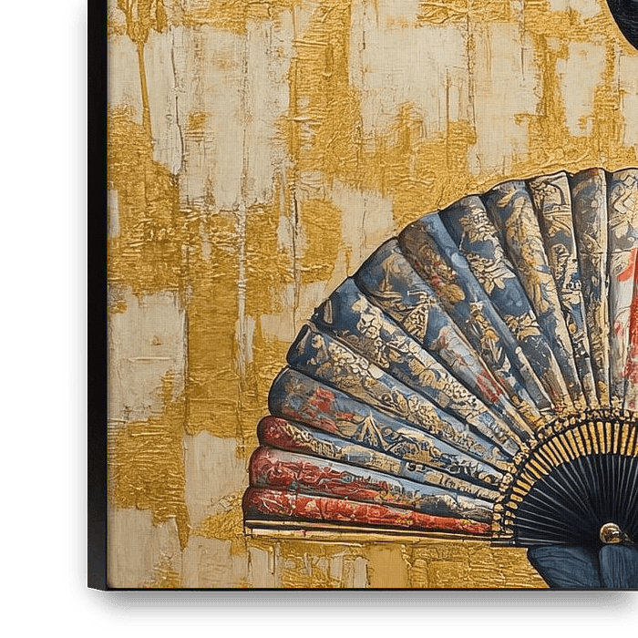 Blumen | Goldener Fächer - Dieses weibliche Porträtgemälde zeigt eine anmutige Dame, die einen auffälligen goldenen Fächer hält, umgeben von einer Fülle bunter Blumen in ihrem Haar, die vor einem goldenen Hintergrund strahlen.