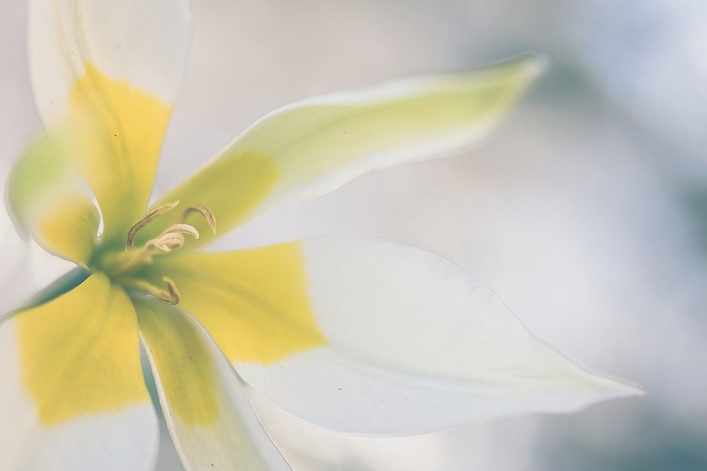 Nahaufnahme einer Tulipa sylvestris mit grauem Bokeh-Hintergrund
