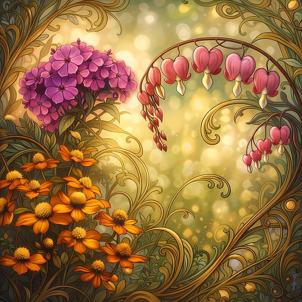 Drei Arten von Blumen vor einem goldenen Hintergrund Jugendstil