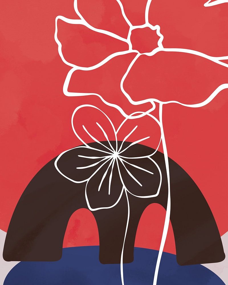 Minimalistische Landschaft bestehend aus organischen Formen, die Blumen und Pflanzen, einen See, eine Brücke und die Sonne darstellen. Die Linienzeichnungen zweier Blumen deuten auf den Frühling oder den Sommer hin.