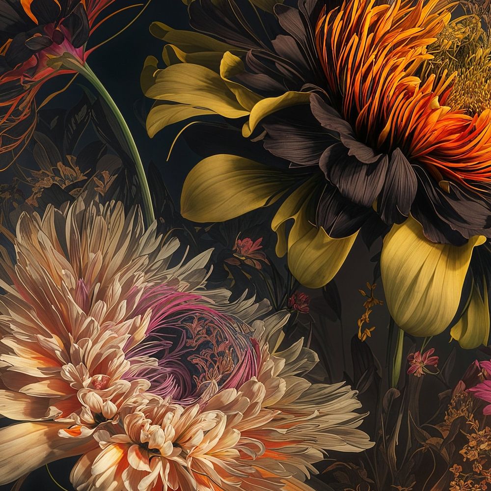 Dieses digitale Kunstwerk ist Teil der Serie "Flowers of Earthly Delights". Die Serie besteht aus Blumenstillleben mit verschiedenen Blumenarten. Für dieses Werk habe ich mich von dem Gemälde "Der Garten der Lüste" des niederländischen Malers Hieronymus Bosch inspirieren lassen. Bosch war ein Maler, der der nördlichen Renaissance angehörte. Sein dreiteiliges Gemälde 'Garten der Lüste' zeigt ein irdisches Paradies, in dem die Sündhaftigkeit des Menschen dargestellt wird. Was mich besonders inspiriert hat, ist, dass das Gemälde ein Triptychon mit einer Vielzahl von Bedeutungen ist, wobei jeder seine eigene Interpretation des Werks hat. Daraus entstand diese dreiteilige Serie 'Flower of Earthly Delights'. Erwähnenswert ist, dass dieses Kunstwerk mit einem Programm erstellt wurde, das künstliche Intelligenz verwendet. Es ist also eine Verschmelzung von alter und neuer Kunst.