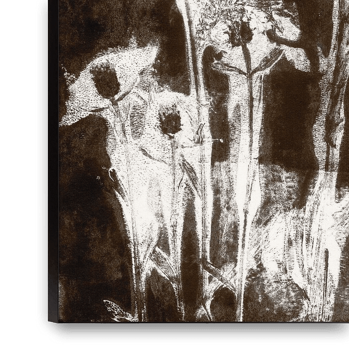 Bestelle dieses Blumen-Wandbild Blumen im Retro-Stil. Moderne botanische minimalistische Kunst in warmem Dunkelbraun und Weiß von Dina Dankers als Reproduktion auf Leinwand, Alu-Dibond, als Poster, Fototapete oder Acrylglasbild.