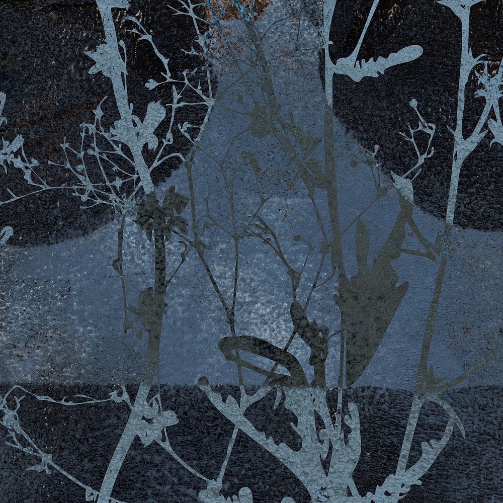 Monotypie mit echten Blumen und Pflanzen und abstrakten Formen.