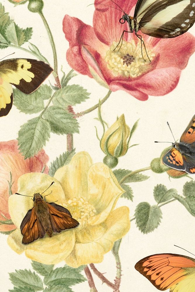 Eine Kombination aus einer Zeichnung von Wildrosen von Antionette Luden und echten Schmetterlingen. Altes trifft auf Neues in einem bunten Ganzen.