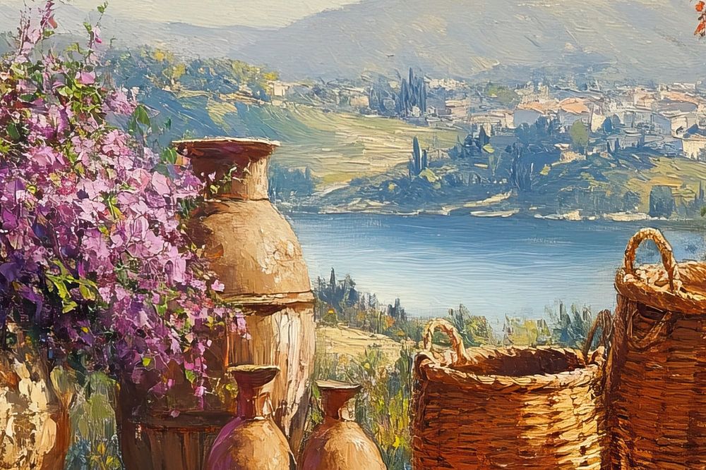 Blumen und Töpfe | Blick auf See mit Töpfen - Dieses Landschaftsgemälde zeigt einige hübsche Tontöpfe mit rosa Blumen auf einer Steinmauer, mit einem friedlichen Blick auf einen See und Berge im Hintergrund.