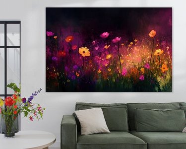 Blumenfeld-Gemälde | Whispers of the Twilight Garden - Dieses Blumenfeld-Gemälde zeigt eine lebendige Landschaft voller bunter Blumen, die sich unter einem mysteriösen, dunklen Himmel erstrecken und eine kontrastreiche und bezaubernde Szene schaffen.