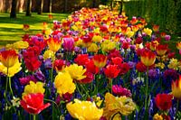 Ein Blumenbeet voller bunter Tulpen und blauer Weintrauben leuchtet in der Sonne. Das Beet ist reichlich mit ihnen gefüllt und bildet einen schönen Kontrast zum grünen Gras und der grünen Hecke daneben. Eine Freude für das Auge.
