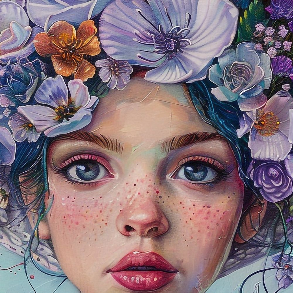In "Flower Girl" verwebt sich die bezaubernde Essenz der Natur mit der anmutigen Anmut eines Mädchens, das mit furchtlosem Blick in die Welt hinausschaut.