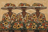 Drei Frauen strahlen inmitten üppiger Sträuße aus Sonnenblumen und Rosen, mit wunderschönen breitkrempigen Hüten, die mit frischen Blumen geschmückt sind. Ihre Blusen mit Blumenmuster fügen sich nahtlos in die farbenfrohe Marktatmosphäre ein. Dieses afrikanische figurative Gemälde in warmen Erdtönen zelebriert die Verbindung zwischen…
