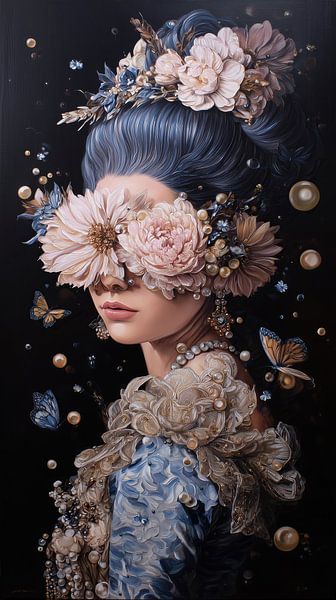 Bloemmasker met Parels - Je kijkt naar een portret waarin één beeldbeslissing alles bepaalt: de ogen zijn volledig bedekt door een uitbundige compositie van bloemen. Grote, zachtroze en perzikkleurige bloemkoppen — chrysanten en dahlia-achtige bloesems — liggen als een blinddoek over het gezicht. In dit bloemen schilderij zijn de…