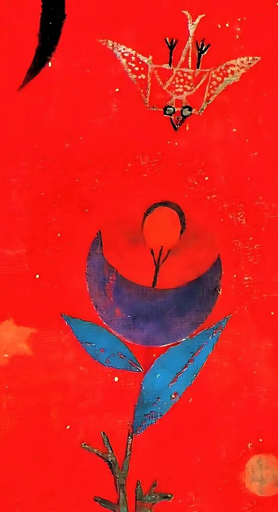 Klees einzigartiger Stil zeigt sich in der Komposition, in der geometrische Formen und komplizierte Muster harmonisch mit den organischen Formen der Blumen verschmelzen. Die Farben sind kühn und ausdrucksstark, mit einer spielerischen Verwendung von kontrastierenden Tönen, die die Komposition zum Leben erwecken.