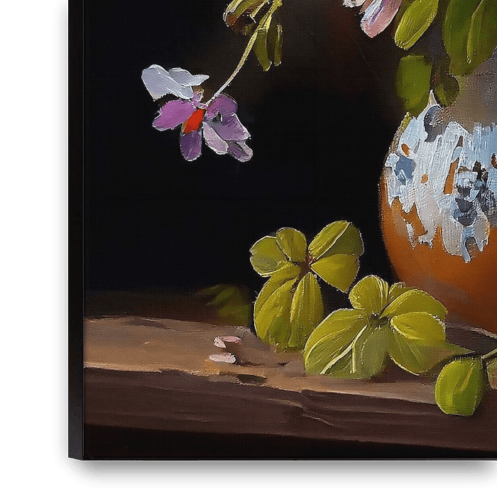 Malerei eines Stilllebens von lila lila Blumen auf einem Steingut Terrakotta vasef mit blauen accejtej. grüne Blätter und gefallene Blumen auf dem Tisch geben es eine lockere Optik. Schöne Schattierungen zu verschiedenen Stilen und Trends passen.