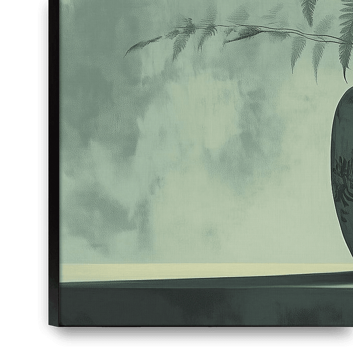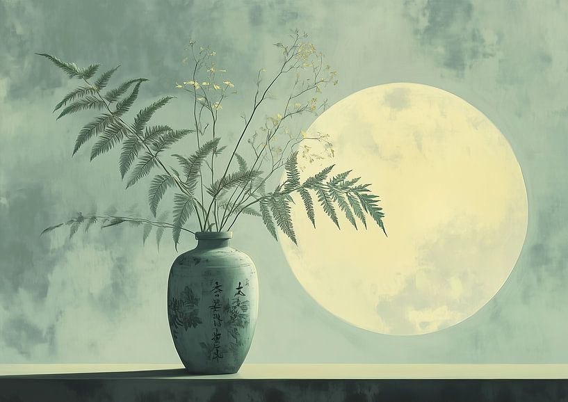 Blumenstillleben – Dieses Blumenbild zeigt ein Japandi-Stillleben mit einer mattgrünen Keramikvase voller langer farnähnlicher Zweige und zarter gelber Blüten vor einem großen, sanftgelben Mondlichtfeld auf mintgrünem Hintergrund – ein ruhiges, modernes Stillleben und Blumenbild, das sich ideal für eine moderne Einrichtung…
