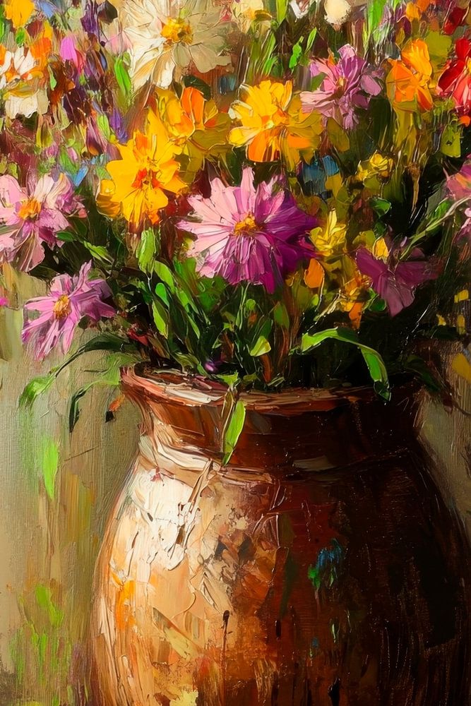 Ein Farbenrausch entfaltet sich aus einem rustikalen Krug, dessen ockerfarbene Oberfläche harmonisch mit den leuchtenden Blüten miteinander verschmilzt. Zarte Lila- und Gelbtöne tanzen untereinander, während lebhafte Farben die Sinne betören. Diese lebendige Komposition, umhüllt von sanften Pinselstrichen, strahlt eine erfrischende Fröhlichkeit aus, die den Raum mit einer einladenden Wärme füllt.