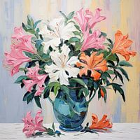 Bouquet of Lilies | Lily Painting - Dieses lebendige Gemälde zeigt einen Strauß üppiger Lilien in verschiedenen Farben, kunstvoll arrangiert in einer klassischen blauen Vase auf einem Tisch. Der impressionistische Stil erweckt die Blumen mit dicken Pinselstrichen zum Leben, die Textur und Tiefe erzeugen, während die Farbpalette von…