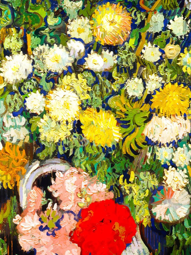 Dieses Stillleben wird in Van Goghs Briefen nicht erwähnt und hat die Gelehrten über seinen Platz in seinem künstlerischen Schaffen verwirrt. Das Sujet hat eine gewisse Verbindung zu den gemischten Sommerblumensträußen, die er in Paris anfertigte; das quasi-abstrakte florale Tapetendesign in der Berceuse von Arles (1996.435) und die weiße Porzellanvase in den Schwertlilien von Saint-Rémy. Die Palette und der Stil dieses Gemäldes, insbesondere die charakteristischen Blau- und Ockertöne und die graphischen Ziegelsteinschattierungen, verbinden es jedoch fest mit den Landschaften, die kurz vor seinem Tod in Auvers am 29. Juli 1890 entstanden.