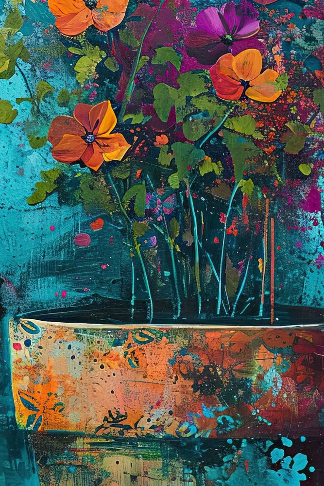 Flower Bowl Explosion - Dieses lebendige und strukturierte Gemälde fängt die Essenz einer blühenden Blumenschale mit einem dynamischen Hintergrund ein. Die farbenfrohen Blumen bilden einen schönen Kontrast zu den dunklen, tiefblauen und türkisen Farbtönen, während Spritzer und Tropfen ein spielerisches Element hinzufügen und die Bewegung verstärken.