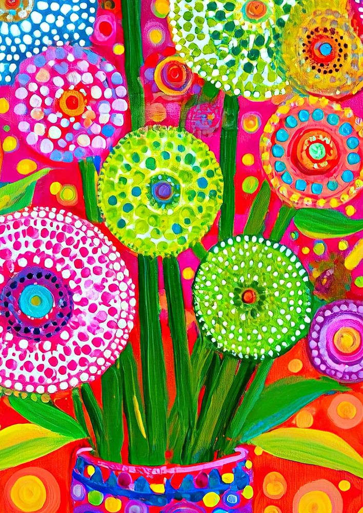 Flower Vase | Bright Flower Party Vibes - Dieses farbenfrohe Blumenbild zeigt eine fröhliche Vase mit großen, runden Blumen in leuchtenden Farben wie Rot, Grün und Blau vor einem leuchtend rosa Hintergrund voller verspielter Punkte, die dem Kunstwerk einen energiegeladenen Look verleihen.